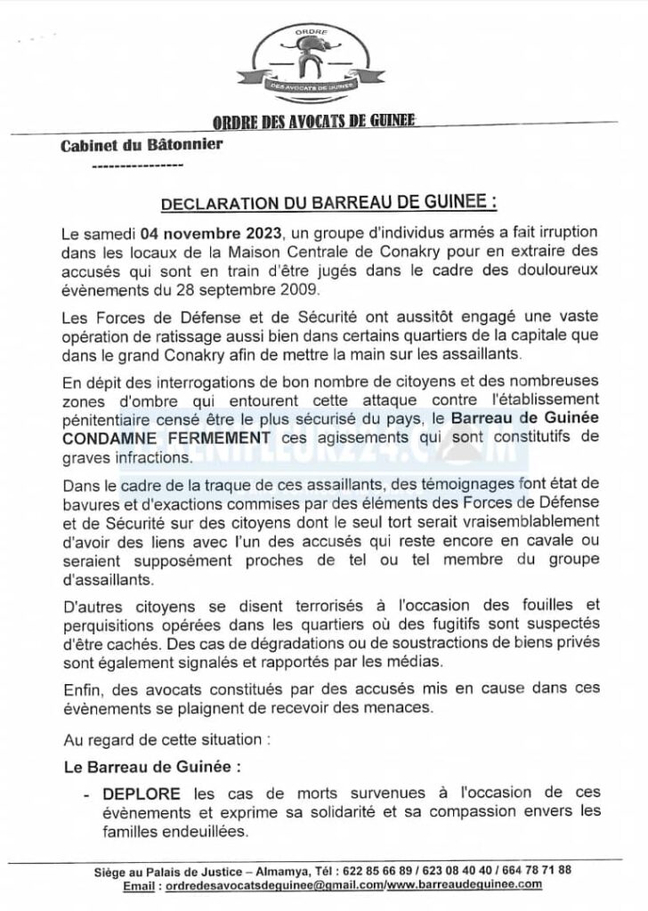 En dépit des interrogations de bon nombre de citoyens et des nombreuses zones d’ombre qui entourent cette attaque contre l’établissement pénitentiaire censé être le plus sécurisé du pays, le Barreau de Guinée CONDAMNE FERMEMENT ces agissements qui sont constitutifs de graves infractions.