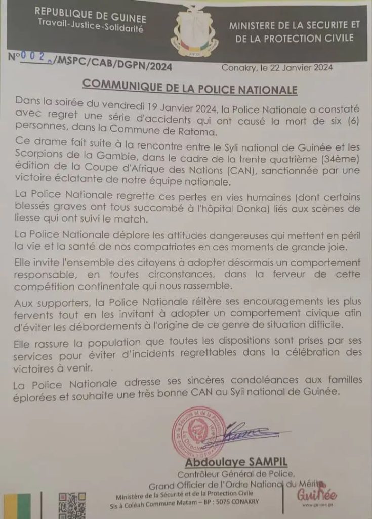 La Police Nationale adresse ses sincères condoléances aux familles éplorées et souhaite une très bonne CAN au Syli national de Guinée.