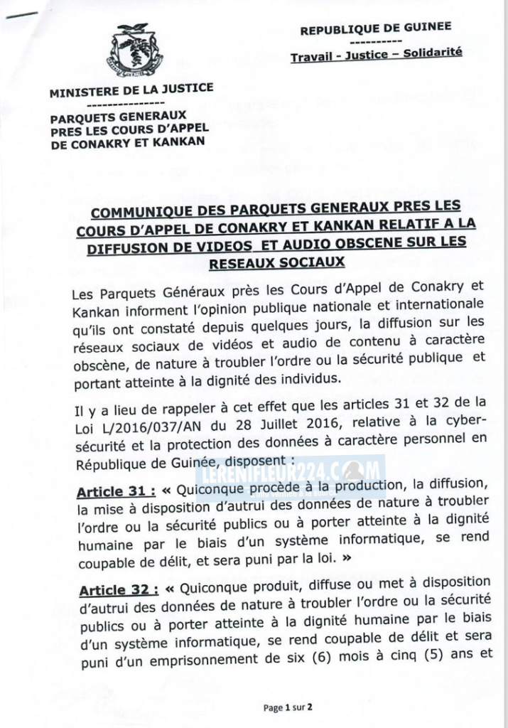 Les Parquets Généraux près les Cours d’Appel de Conakry et Kankan informent l’opinion publique nationale et internationale qu’ils ont constaté depuis quelques jours, la diffusion sur les réseaux sociaux de vidéos et audio de contenu à caractère obscène, de nature à troubler l’ordre ou la sécurité publique et portant atteinte à la dignité des individus.