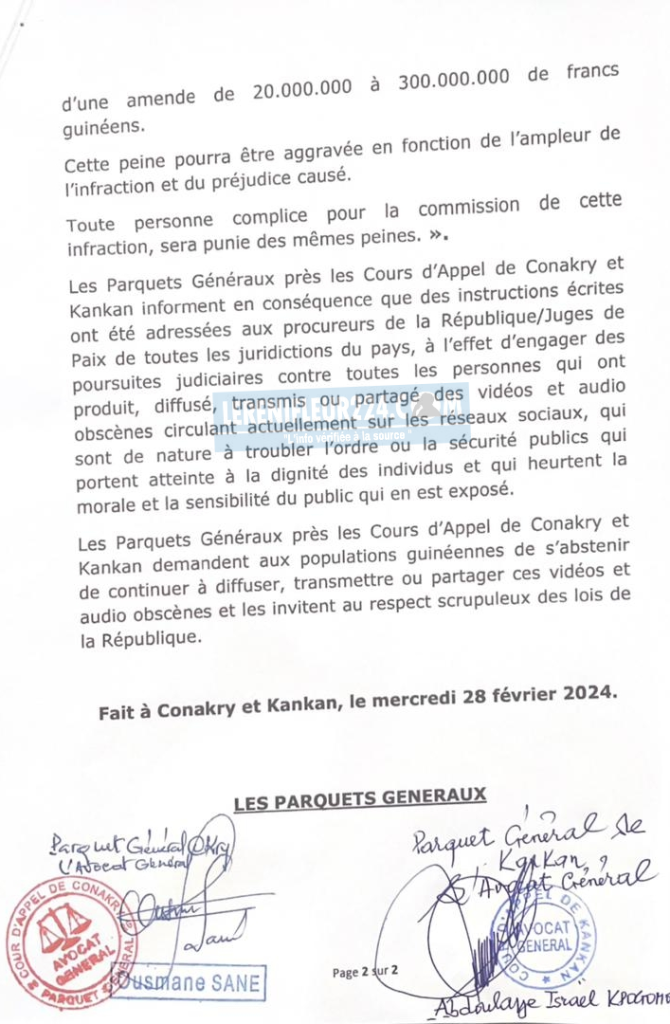 Les Parquets Généraux près les Cours d’Appel de Conakry et Kankan demandent aux populations guinéennes de s’abstenir de continuer à diffuser, transmettre ou partager ces vidéos et audio obscènes et les invitent au respect scrupuleux des lois de la République.