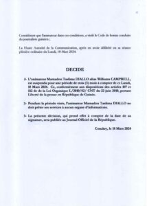 Par conséquent, l’animateur selon la HAC à violé le code de conduite du journalisme en Guinée. Le collège des commissaires des cette institution le suspend pour une période de trois(3).