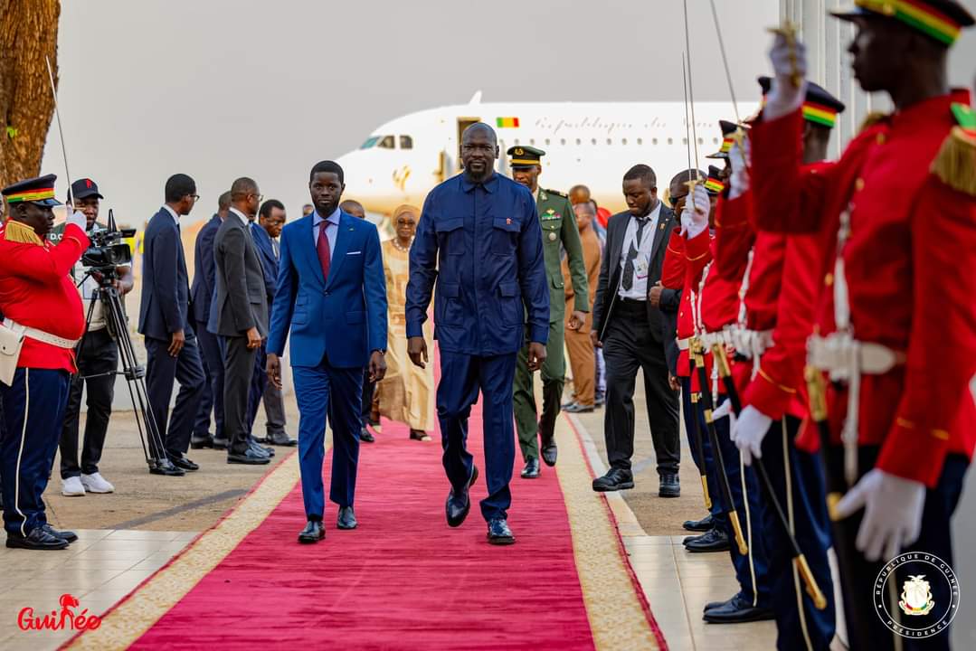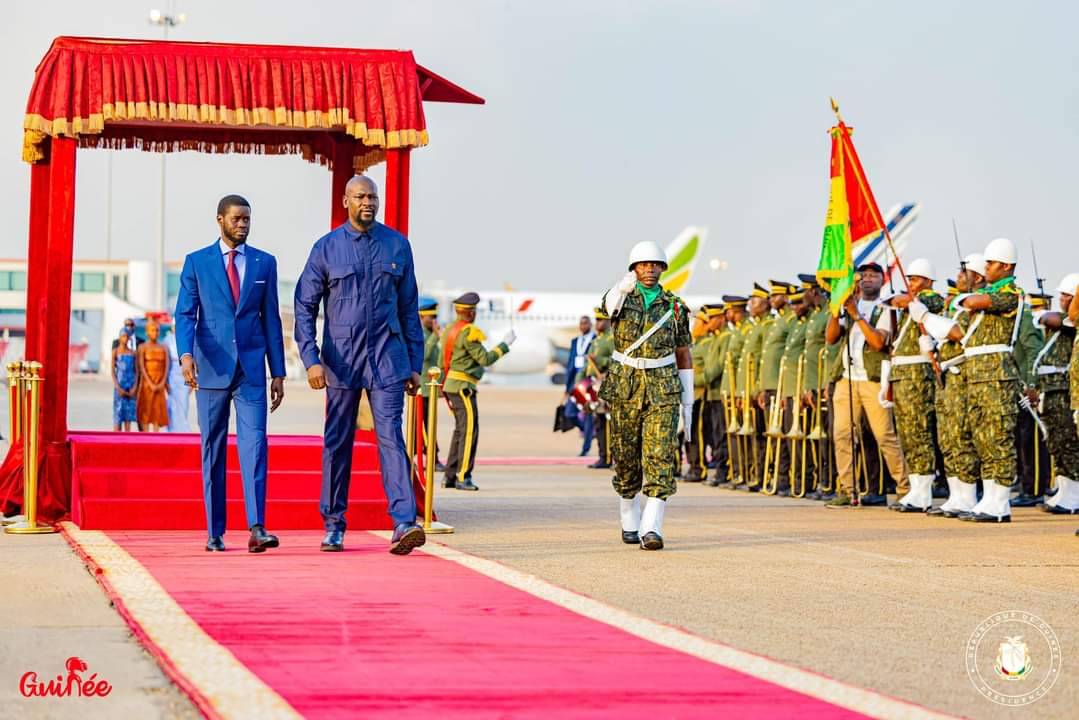 À son arrivée à l’aéroport international Ahmed Sékou Touré de Conakry en début de soirée, Son Excellence Monsieur Bassirou Diomaye Faye, Président de la République du Sénégal, a été accueilli avec les honneurs par son homologue, le Général de Corps d’armée Mamadi Doumbouya, Président de la République sœur de Guinée.