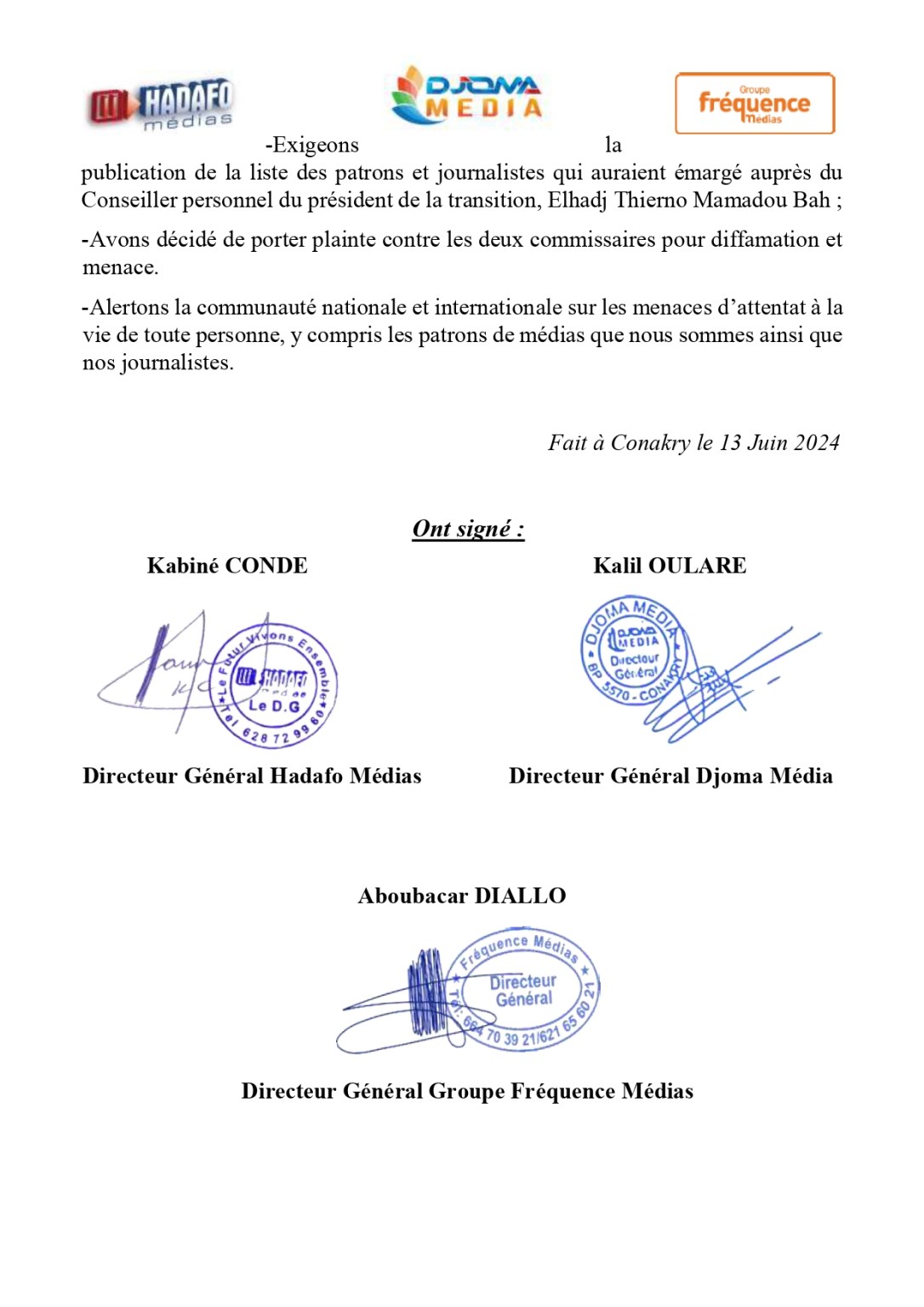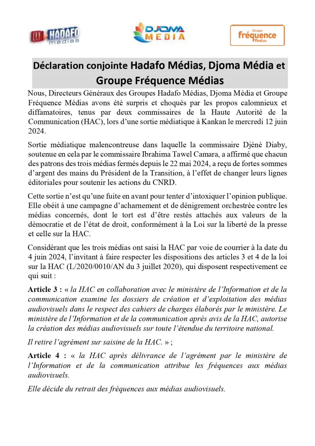 Nous, Directeurs Généraux des Groupes Hadafo Médias, Djoma Média et Groupe Fréquence Médias avons été surpris et choqués par les propos calomnieux et diffamatoires, tenus par deux commissaires de la Haute Autorité de la Communication (HAC), lors d’une sortie médiatique à Kankan le mercredi 12 juin 2024.