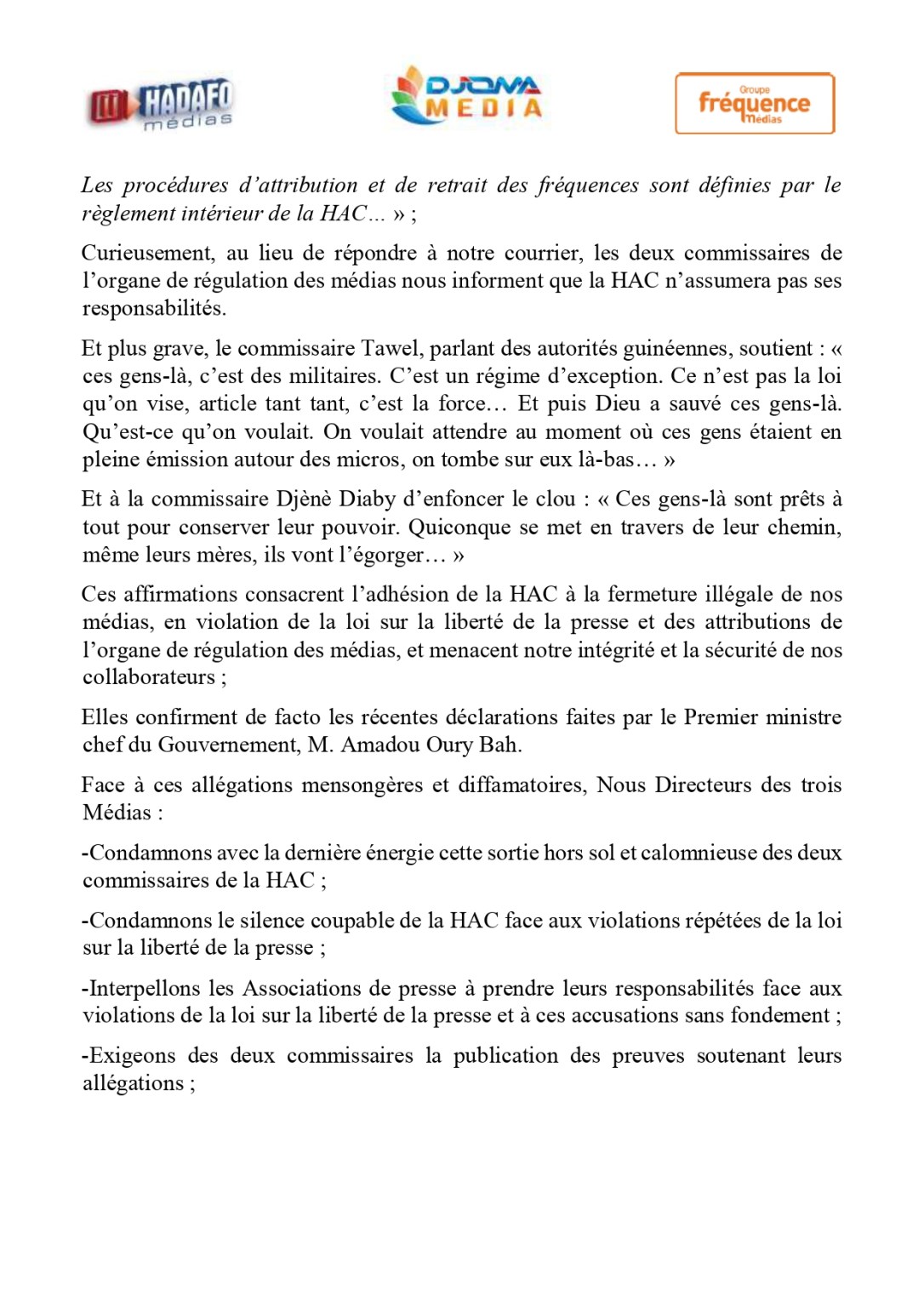Elles confirment de facto les récentes déclarations faites par le Premier ministre chef du Gouvernement, M. Amadou Oury Bah. Face à ces allégations mensongères et diffamatoires, Nous Directeurs des trois Médias:
