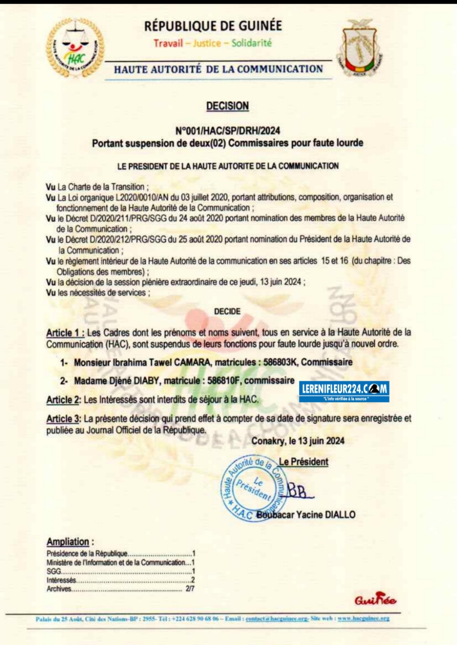 Le Collège de la Haute Autorité de la Communication, réuni en sa session extraordinaire de ce Jeudi 13 Juin 2024, demande instamment au Président de la HAC de bien vouloir prendre les mesures administratives et disciplinaires