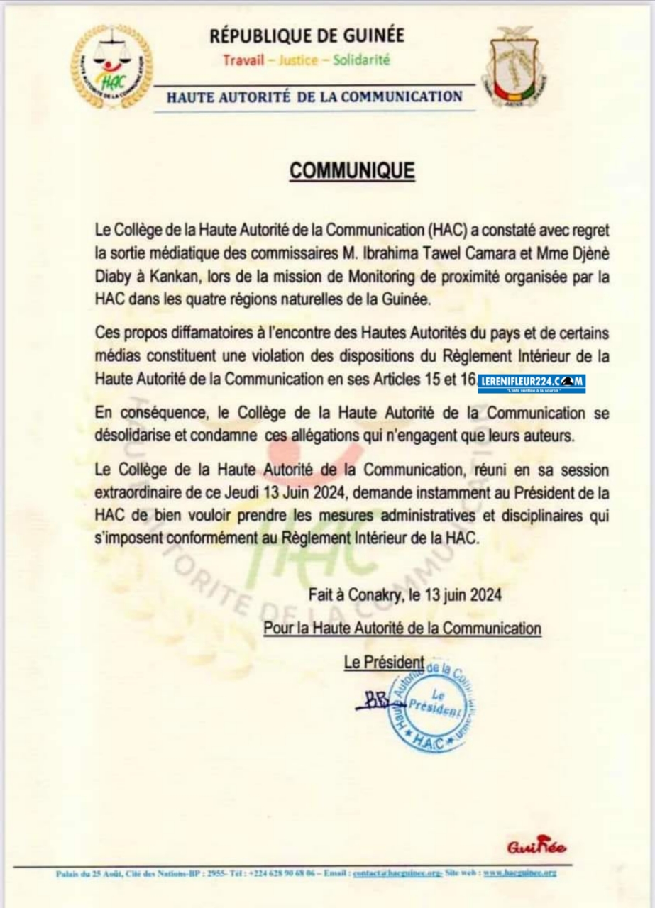 Le Collège de la Haute Autorité de la Communication (HAC) a constaté avec regret la sortie médiatique des commissaires M. Ibrahima Tawel Camara et Mme Djènè Diaby à Kankan, lors de la mission de Monitoring de proximité organisée par la HAC dans les quatre régions naturelles de la Guinée.