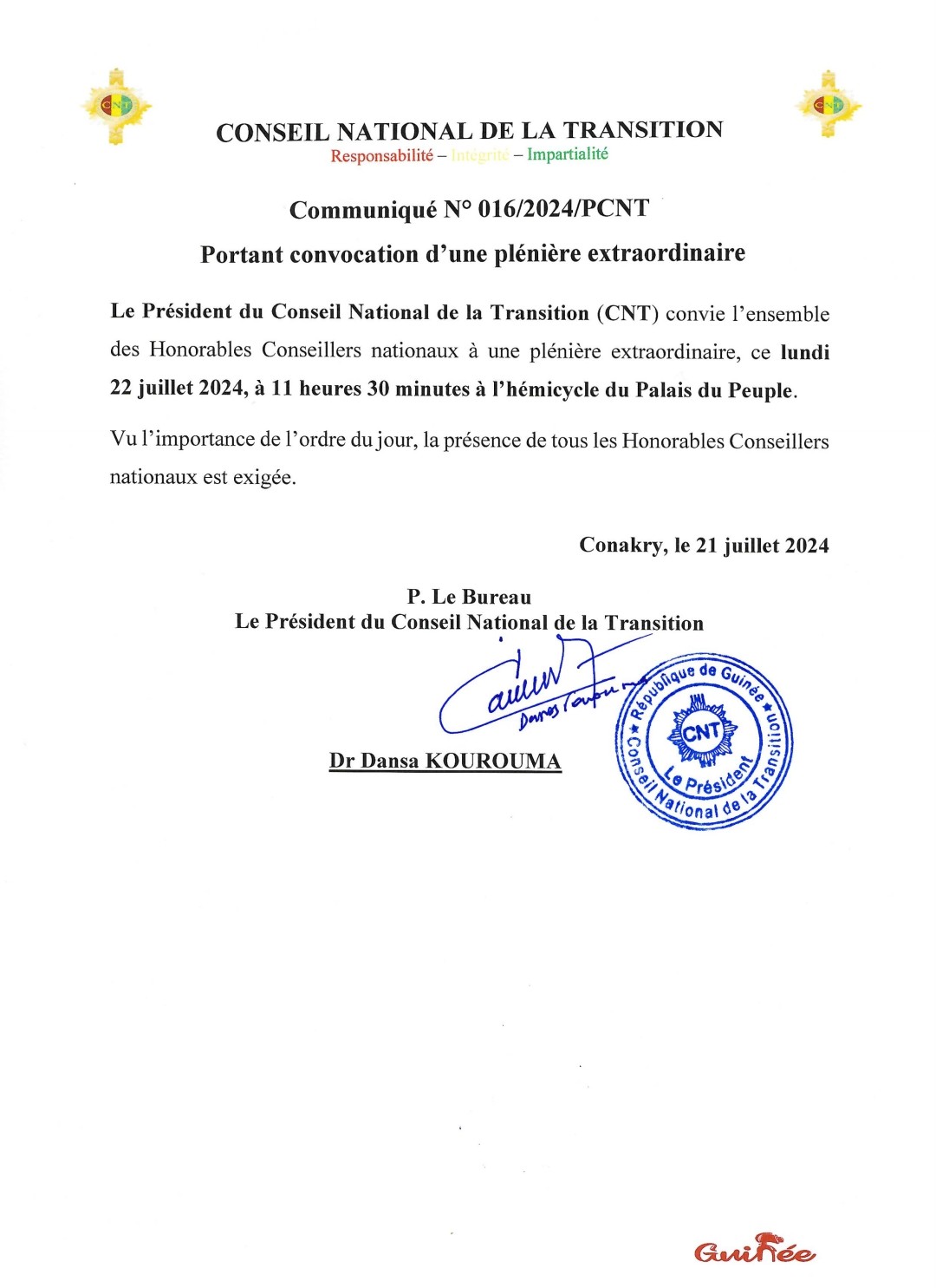 Le Président du Conseil National de la Transition (CNT) convie l’ensemble des Honorables Conseillers nationaux à une plénière extraordinaire, ce lundi 22 juillet 2024, à 11 heures 30 minutes à l’hémicycle du Palais du Peuple.