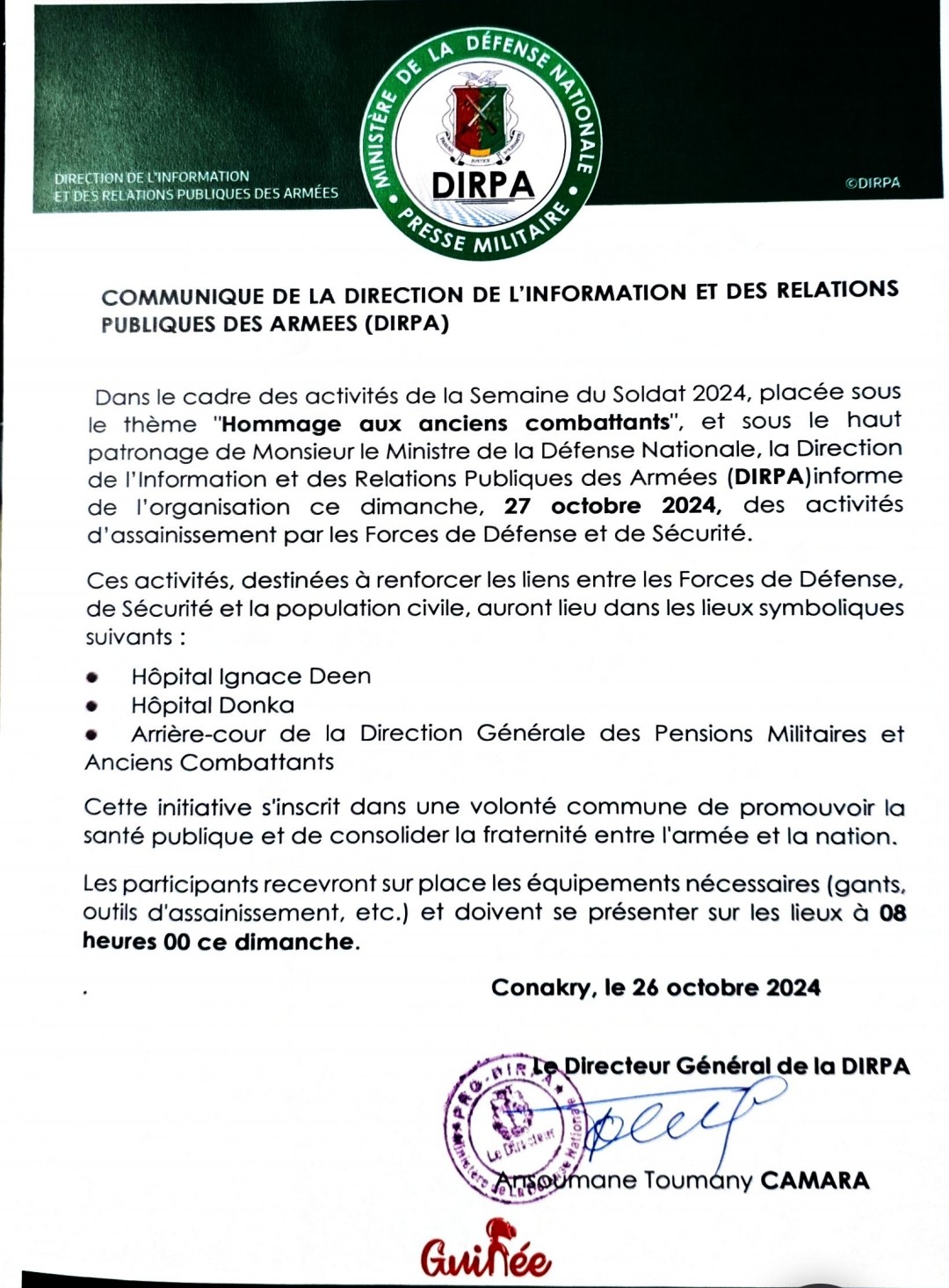 Dans le cadre de la Semaine du Soldat 2024, placée sous le thème « Hommage aux anciens combattants », les Forces de Défense et de Sécurité marquent cette édition par une initiative citoyenne forte. Sous le haut patronage du Ministre de la Défense Nationale, une journée d’assainissement est organisée ce dimanche 27 octobre 2024, dans des lieux emblématiques tels que l’Hôpital Ignace Deen, l’Hôpital Donka et l’arrière-cour de la Direction Générale des Pensions Militaires et Anciens Combattants.