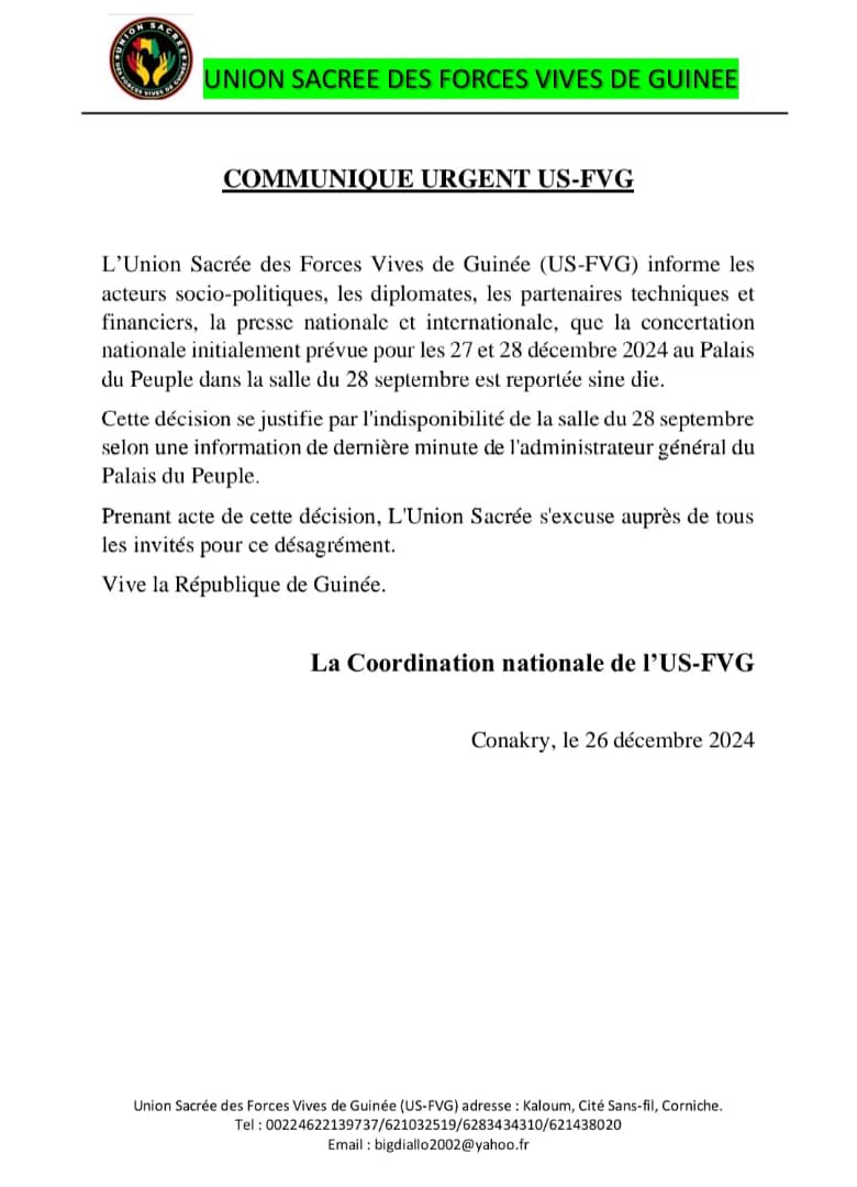 La Coordination nationale de l’Union Sacrée des Forces Vives de Guinée (US-FVG) a annoncé, dans une note officielle, le report sine die de la concertation nationale qui devait se tenir les 27 et 28 décembre 2024 au Palais du Peuple, dans la salle du 28 septembre.