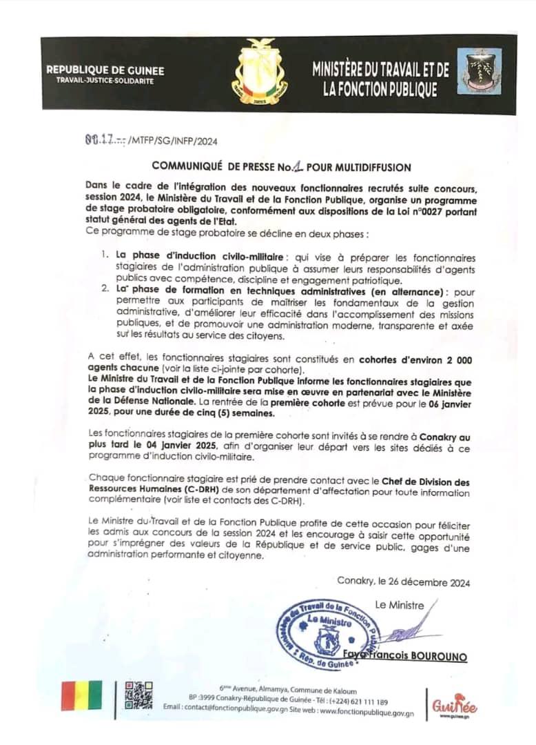 Les stagiaires seront répartis en cohortes de 2 000 agents chacune. La première cohorte, convoquée à Conakry au plus tard le 4 janvier 2025, entamera la phase d’induction civilo-militaire dès le 6 janvier pour une durée de cinq semaines. Les participants sont invités à prendre contact avec le Chef de Division des Ressources Humaines (C-DRH) de leurs départements respectifs pour les détails logistiques.