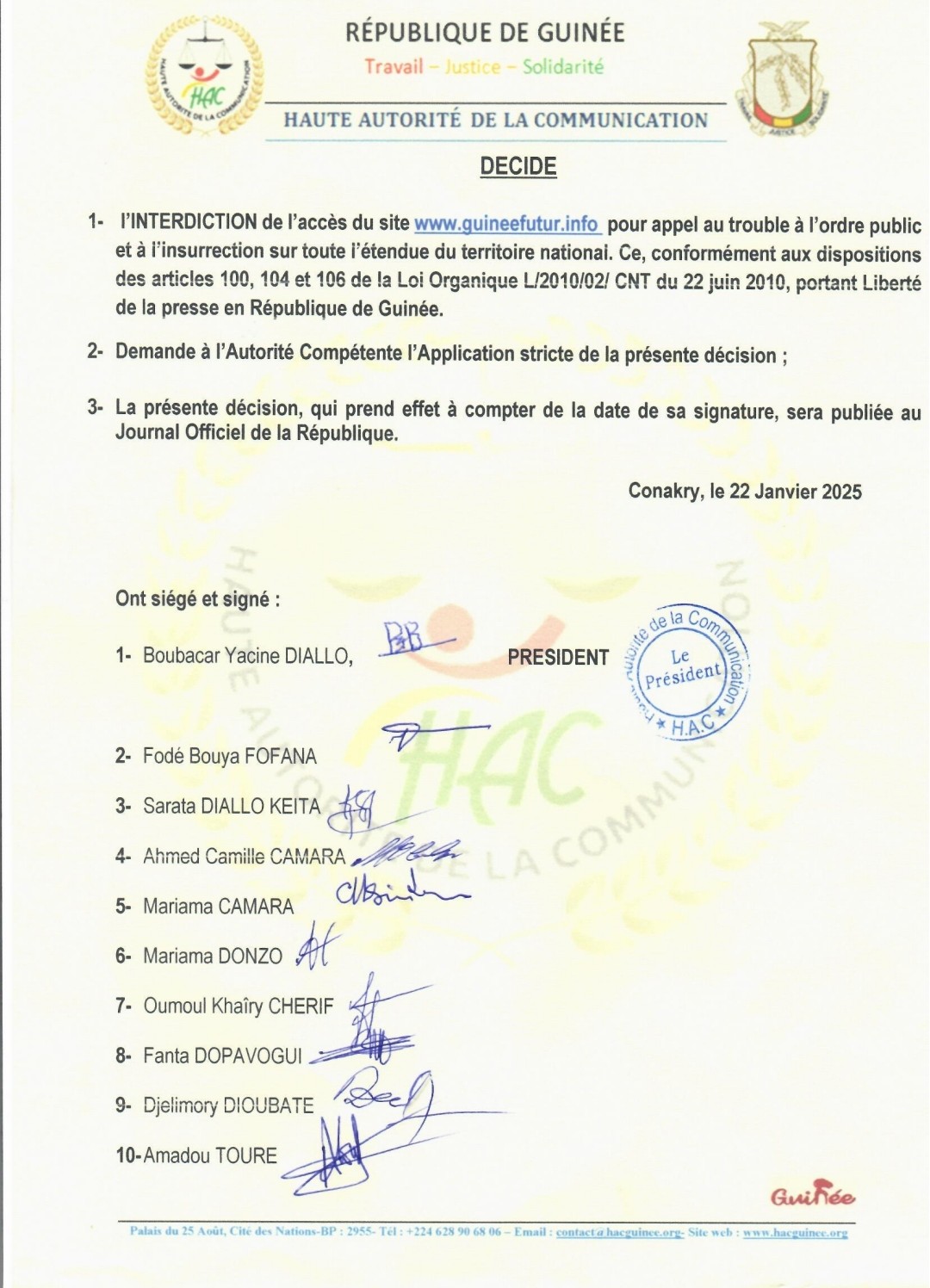Dans une décision rendue publique, la Haute Autorité de la Communication (HAC) de la République de Guinée a ordonné l’interdiction d’accès au site internet www.guineefutur.info. Cette mesure intervient après des accusations portées contre le média en ligne pour avoir diffusé des contenus appelant au trouble à l’ordre public et à l’insurrection sur l’ensemble du territoire national.