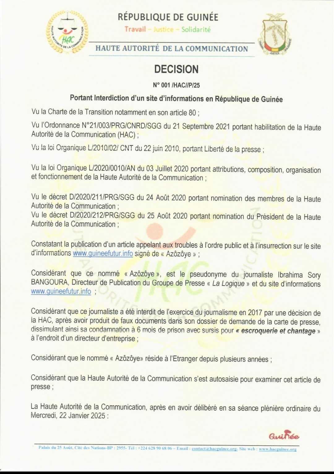 Urgent / La HAC interdit le site Guinée Futur du journaliste Azozoye pour incitation à l’insurrection