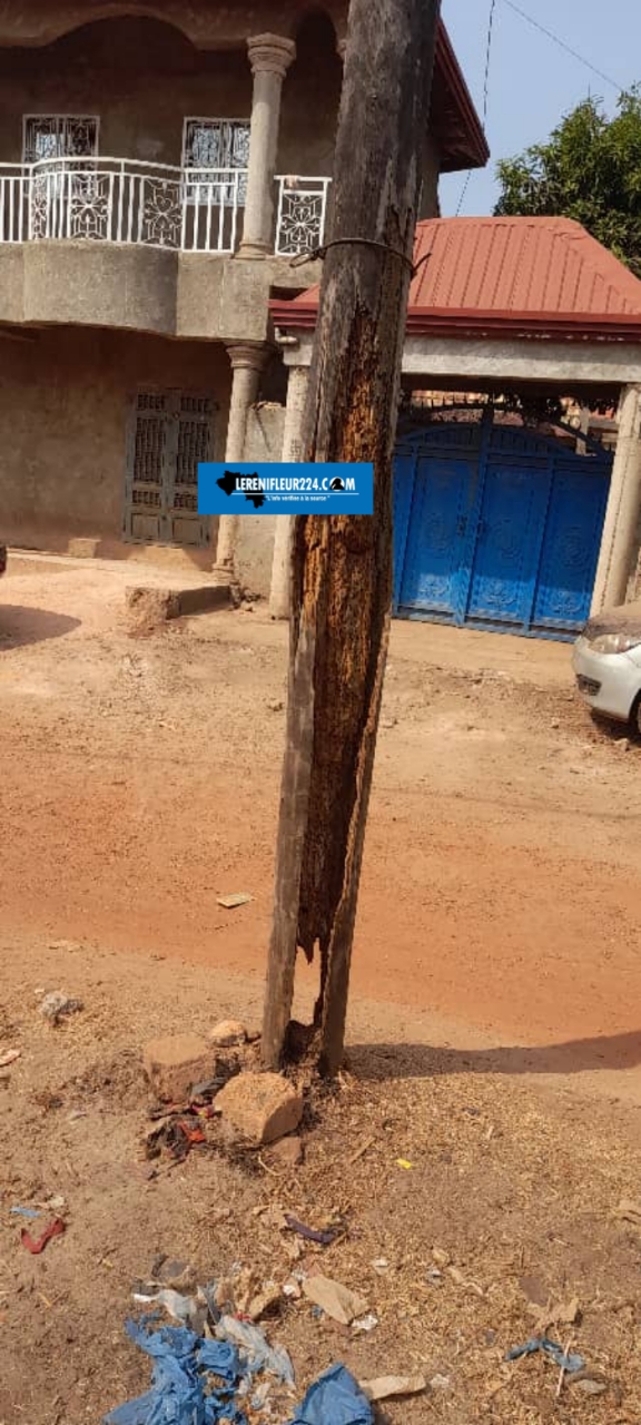 De nombreux poteaux électriques en bois, portant des fils de tension normale, présentent un état de défectuosité avancée dans la commune urbaine de Mamou. Ces infrastructures, situées en bordure de route et à proximité des habitations, menacent de s’effondrer, risquant de causer des dégâts matériels et humains si aucune mesure n’est prise.