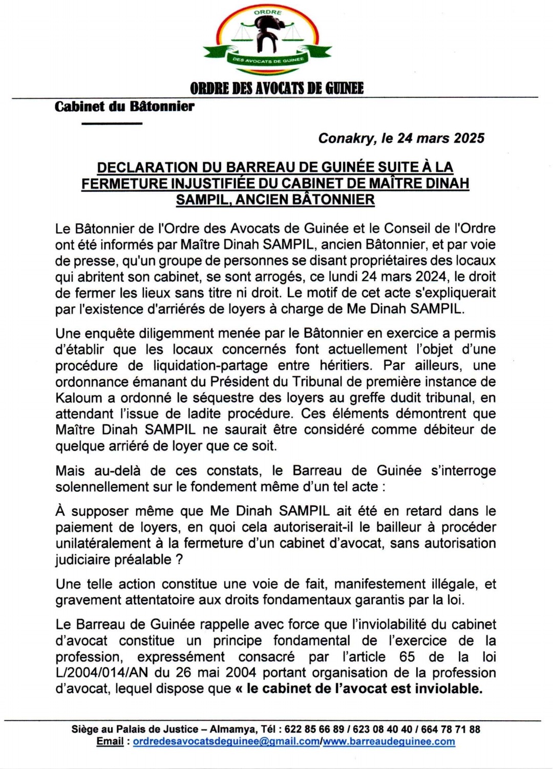 La fermeture, jugée arbitraire, du cabinet de Maître Dinah Sampil, ancien Bâtonnier de l’Ordre des Avocats de Guinée, suscite une vive indignation au sein du Barreau guinéen. Dans une déclaration officielle publiée ce mardi 25 mars 2025, l’Ordre des Avocats dénonce une « voie de fait illégale » et exige la réouverture immédiate des locaux.