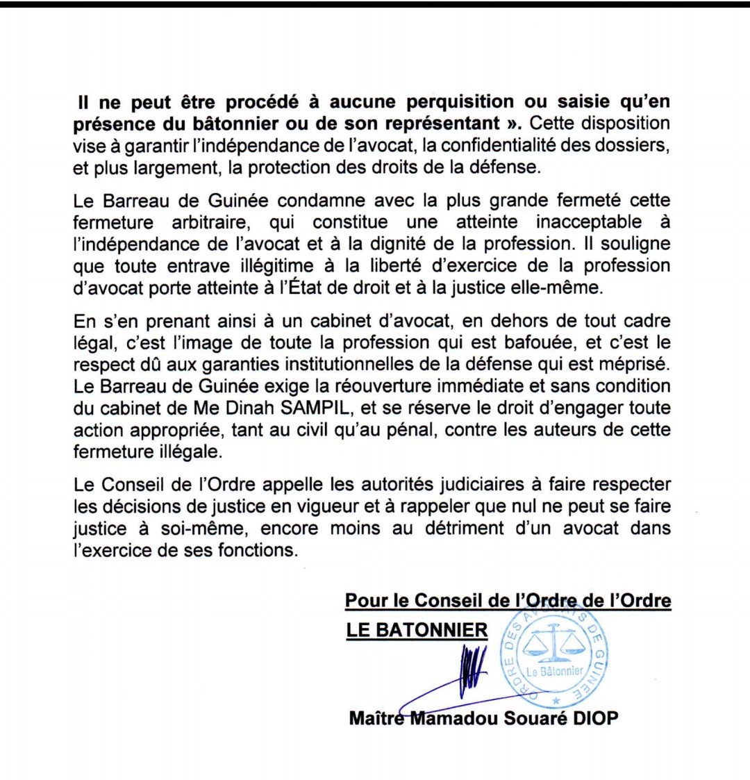 Le Barreau de Guinée souligne que cette fermeture constitue une grave violation de l’article 65 de la loi L/2004/014/AN du 26 mai 2004, qui garantit l’inviolabilité du cabinet d’un avocat. Toute saisie ou fermeture de ce type ne peut être effectuée qu’en présence du Bâtonnier ou de son représentant, ce qui n’a pas été le cas dans cette affaire.