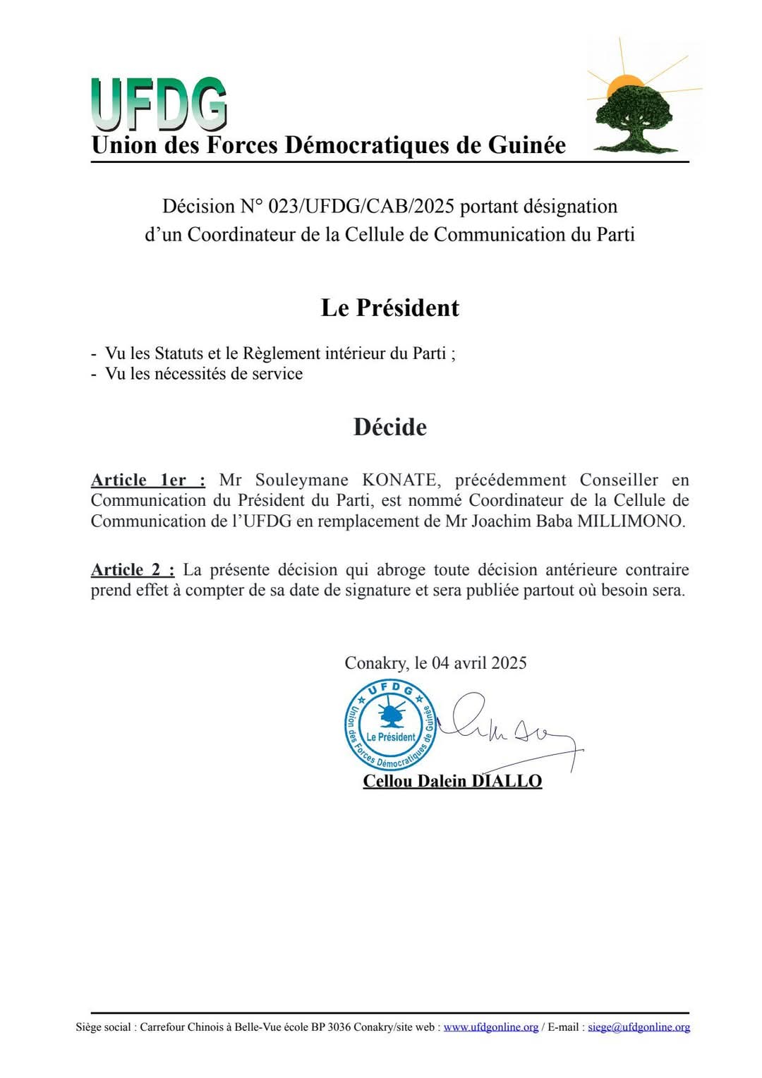 Ce samedi 5 avril 2025, le leader de l’Union des Forces Démocratiques de Guinée (UFDG), Cellou Dalein Diallo, a procédé à un changement majeur au sein de la cellule de communication de son parti. Par décision officielle, M. Souleymane Konaté, précédemment Conseiller en Communication du Président du Parti, est nommé Coordinateur de la Cellule de Communication de l’UFDG. Il succède ainsi à M. Joachim Baba Millimono, qui occupait ce poste jusqu’à présent.