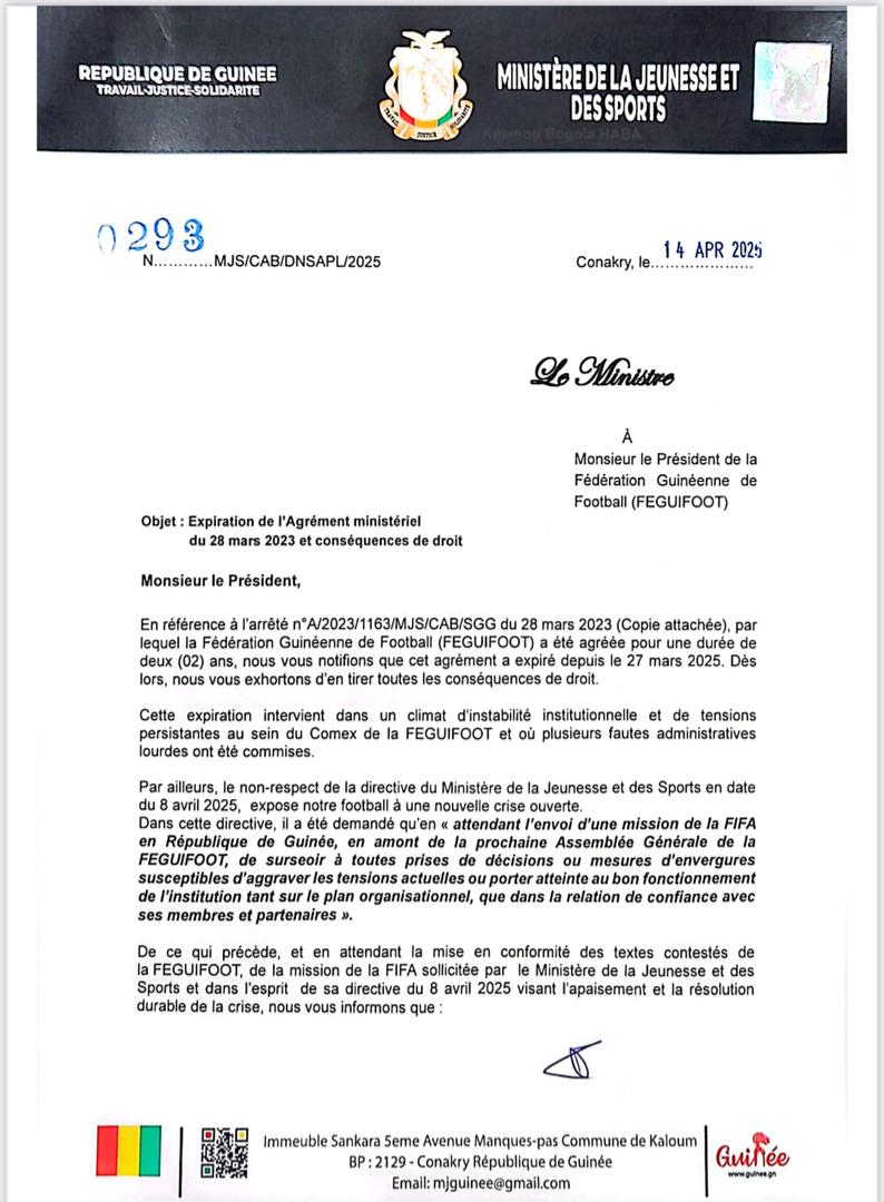 « En référence à l’arrêté n°A/2023/1163/MJS/CAB/SGG du 28 mars 2023 (copie jointe), par lequel la Fédération Guinéenne de Football (FEGUIFOOT) a été agréée pour une durée de deux (02) ans, nous vous notifions que cet agrément a expiré depuis le 27 mars 2025. Dès lors, nous vous exhortons à en tirer toutes les conséquences de droit », a clairement signifié le ministre.