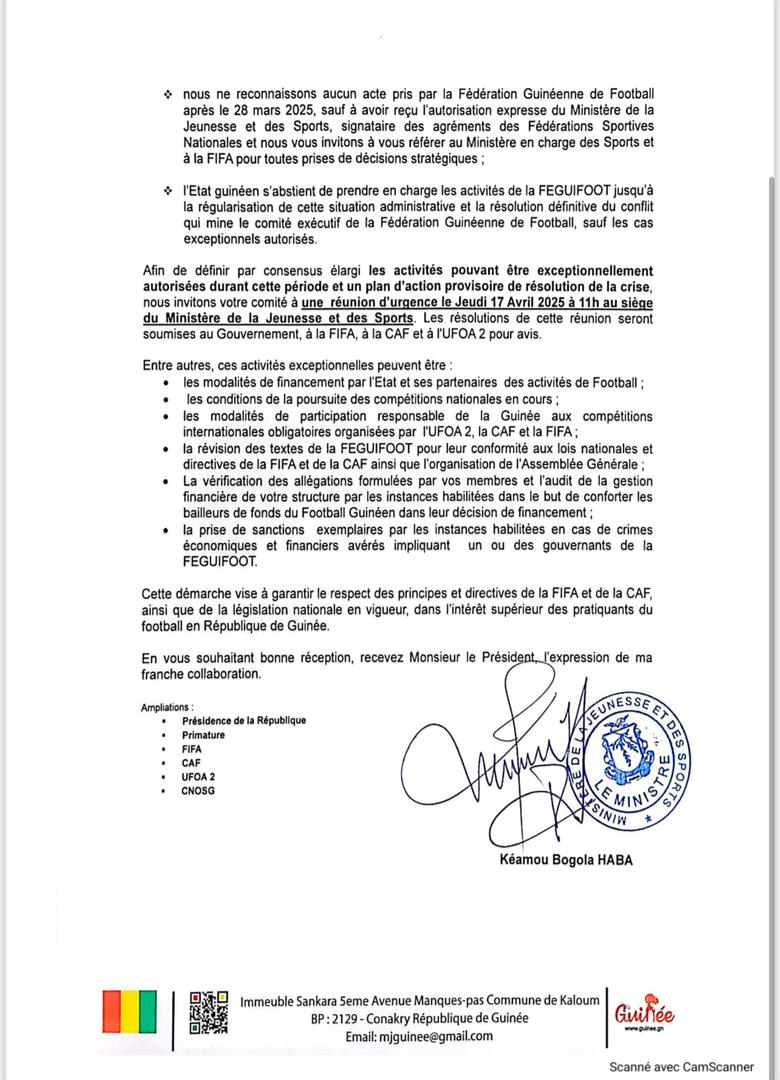 La réaction ferme du chef du département des sports fait suite directe aux récents développements. Dans son courrier, Kéamou Bola Haba insiste sur le non-respect d’une directive ministérielle datée du 8 avril 2025, qui, selon lui, expose le football guinéen à une nouvelle crise ouverte.