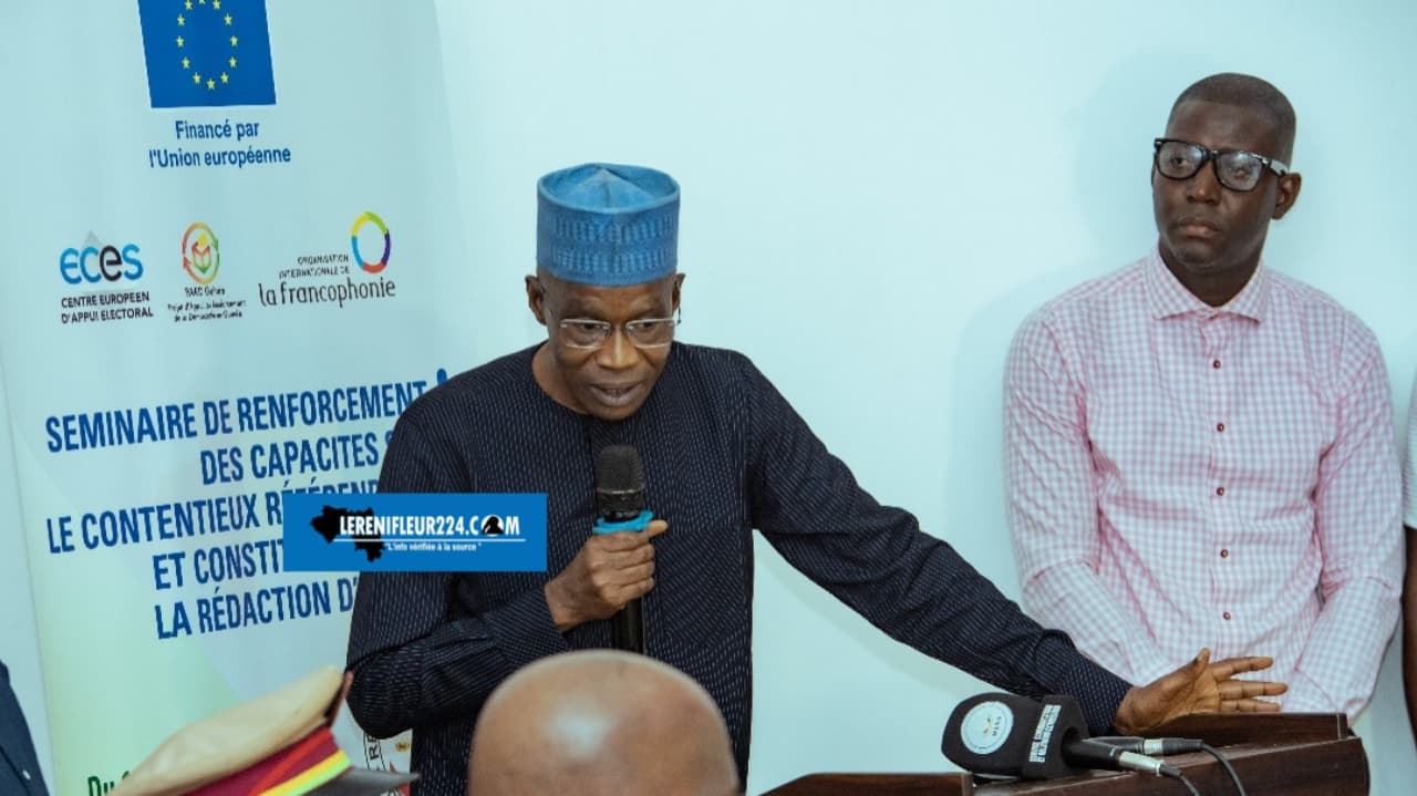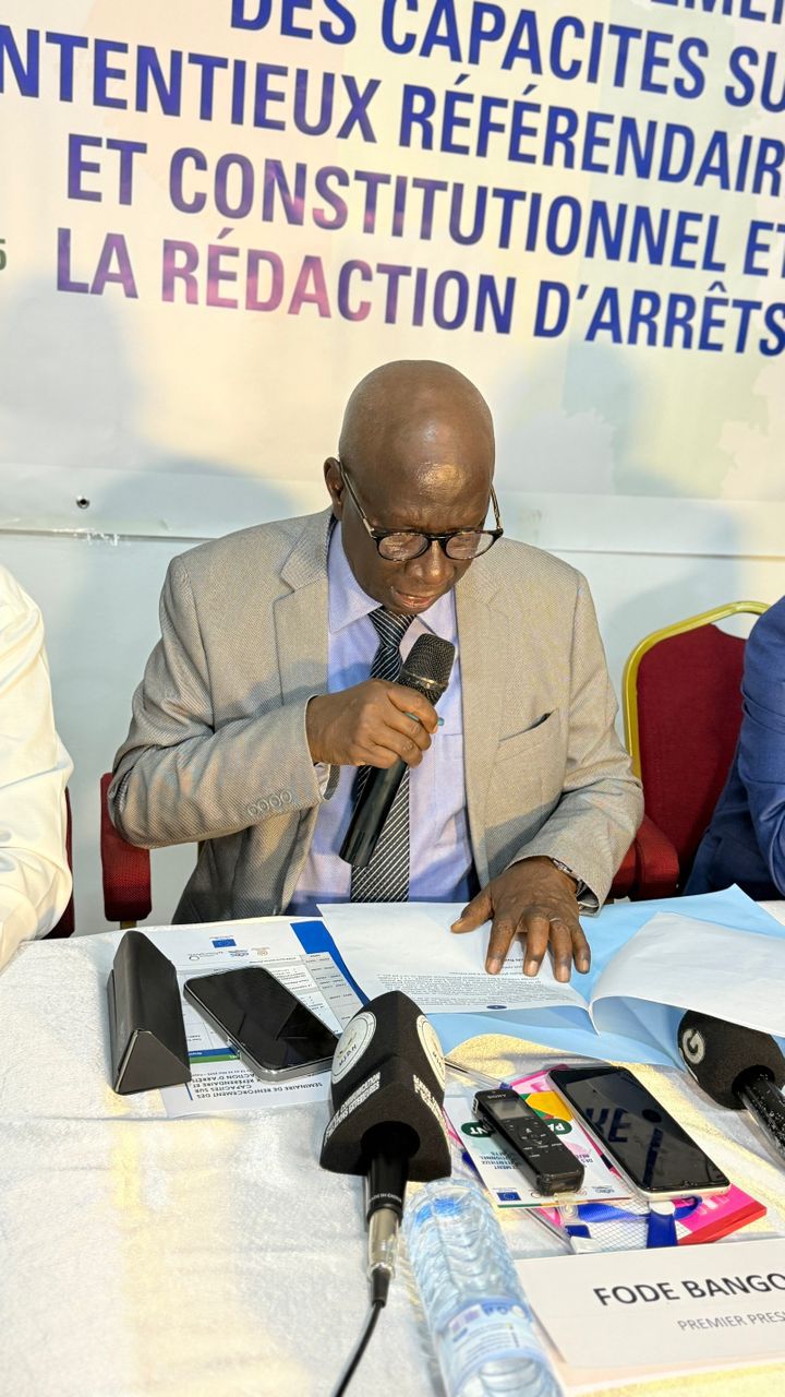 « Je me réjouis de constater que ce séminaire se fixe trois objectifs fondamentaux et qui sont : Premièrement, actualiser les connaissances techniques sur les procédures du contentieux référendaire, notamment en matière de recevabilité, de contrôle de régularité et de traitement des recours électoraux et constitutionnels.  Deuxièmement, renforcer la capacité rédactionnelle pour produire des arrêts clairs, motivés, accessibles aux justiciables et respectueux des standards internationaux.  Troisièmement, favoriser la réflexion stratégique sur l’uniformisation de la jurisprudence et de la prévention des conflits de compétences qui restent des défis majeurs en période électorale. Un tel séminaire s’inscrit à boîte ligne de la vision de refondation de l’Etat prôné par le président de la République, le général Mamadi Doumbouya. »