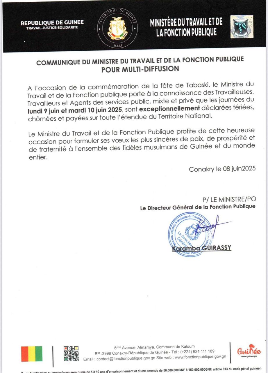 À l’occasion de la fête de Tabaski, célébration majeure du calendrier musulman, le gouvernement guinéen a pris une mesure exceptionnelle. Le Ministre du Travail et de la Fonction publique a annoncé, par voie officielle, que les journées du lundi 9 juin et du mardi 10 juin 2025 seront fériées, chômées et payées sur toute l’étendue du territoire national.