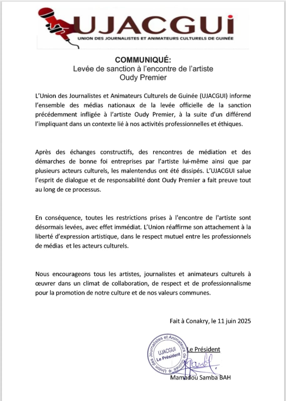 Oudy 1er : ‘’Toutes les restrictions prises à l’encontre de l’artiste sont désormais levées, avec effet immédiat’’ L’UJACGUI prône l’apaisement et le respect mutuel (Communiqué)