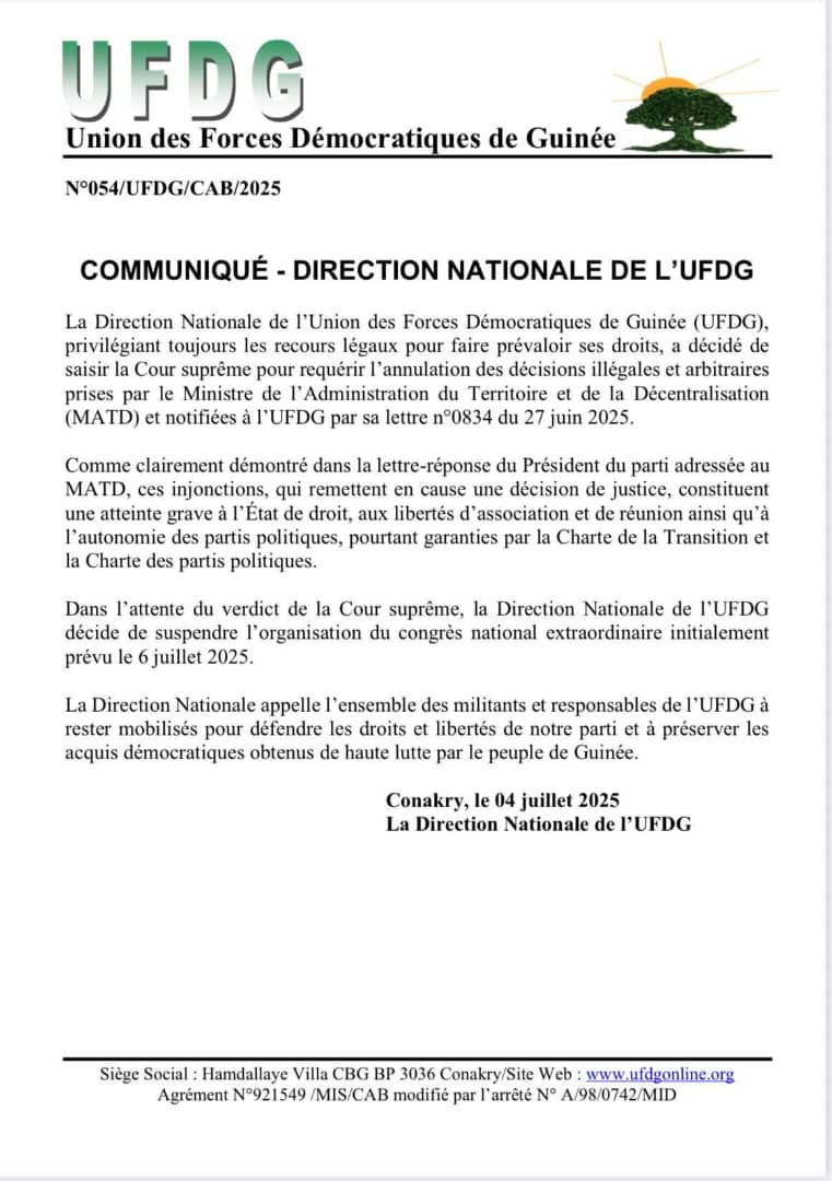 « Dans l’attente du verdict de la Cour suprême, la Direction nationale de l’UFDG décide de suspendre l’organisation du congrès national extraordinaire initialement prévu le 6 juillet 2025 », précise le communiqué.
