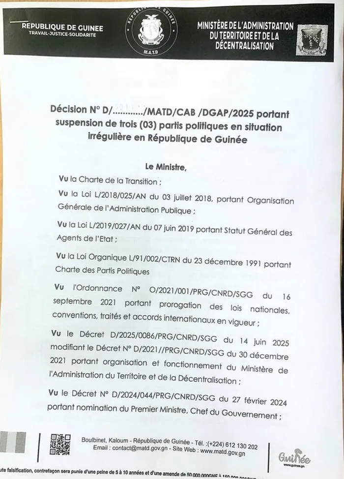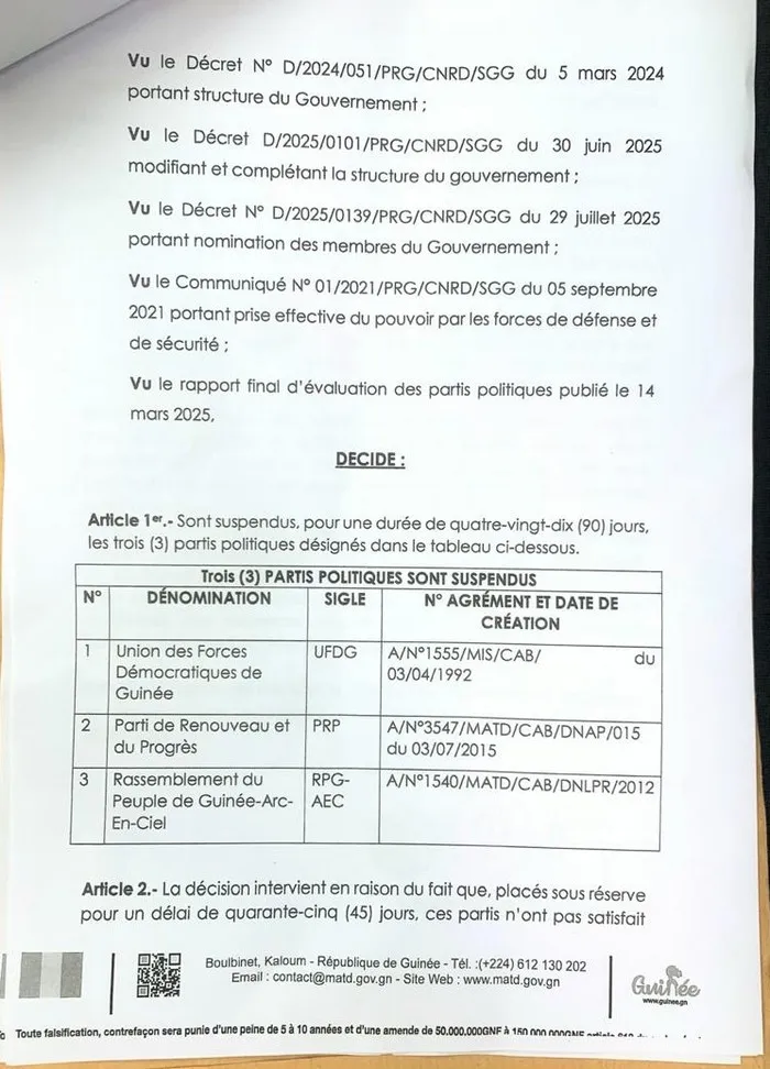 Les partis politiques Union des Forces Démocratiques de Guinée (UFDG), Parti de Renouveau et du Progrès (PRP) et Rassemblement du Peuple de Guinée – Arc-en-ciel (RPG arc-en-ciel) sont officiellement suspendus de toutes activités pour une durée de quatre-vingt-dix (90) jours. L’annonce a été faite par le ministère de l’Administration du Territoire et de la Décentralisation (MATD), qui justifie cette décision par le non-respect, par ces formations politiques, des obligations imposées dans le cadre de leur évaluation.