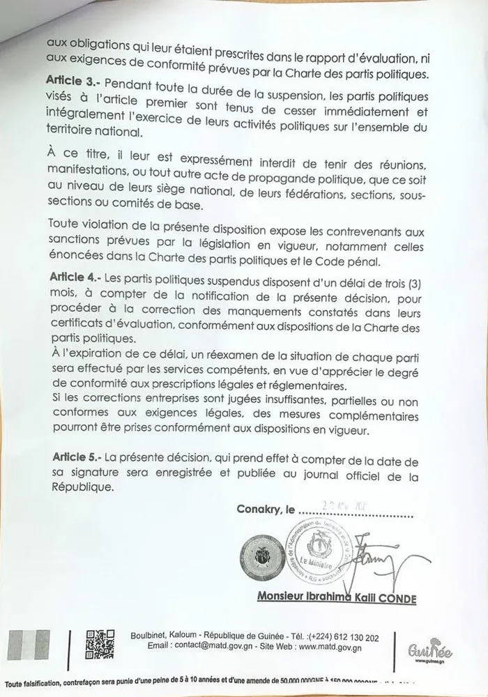 Durant toute la période de suspension, ces partis sont tenus de mettre un terme immédiat et total à leurs activités politiques sur l’ensemble du territoire national. Il leur est formellement interdit d’organiser des réunions, manifestations, ou toute autre forme de propagande politique, que ce soit au siège national ou dans leurs différentes structures (fédérations, sections, sous-sections et comités de base).