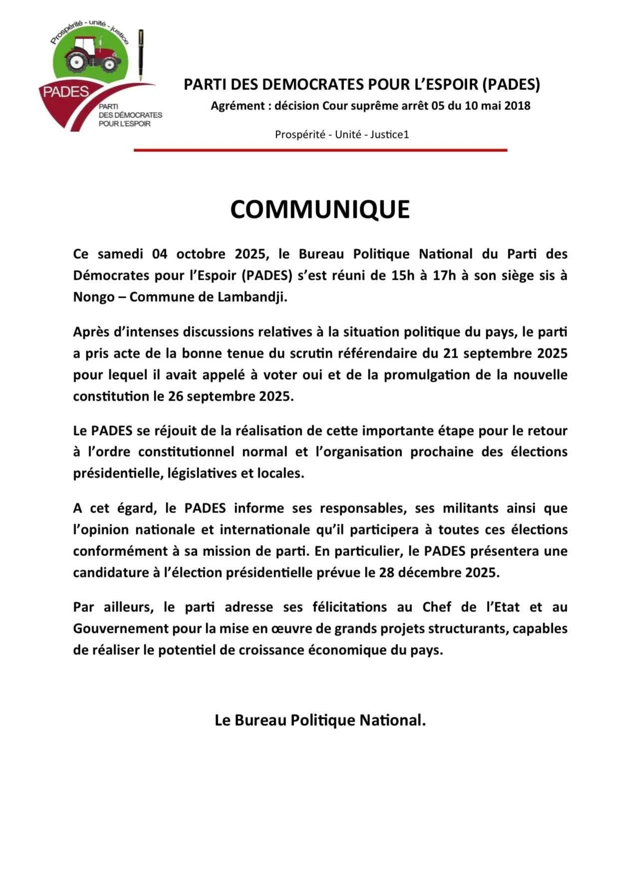 Le PADES a tout d’abord pris acte du bon déroulement du scrutin référendaire du 21 septembre 2025, lors duquel il avait appelé à voter en faveur de la nouvelle Constitution. Le parti se félicite également de la promulgation de ce texte fondamental, intervenue le 26 septembre dernier, qu’il considère comme une étape décisive vers le rétablissement de l’ordre constitutionnel.
