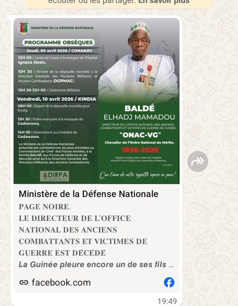 Le Ministre de la Défense Nationale a annoncé, ce mercredi 8 avril 2026, le décès d’Elhadj Mamadou Baldé, Directeur de l’Office National des Anciens Combattants et Victimes de Guerre de Guinée (ONAC-VG) et Chevalier de l’Ordre National du Mérite. Le regretté Elhadj Mamadou Baldé s’est éteint le mardi 7 avril 2026 à Conakry, des suites d’une longue maladie, à l’âge de 90 ans.