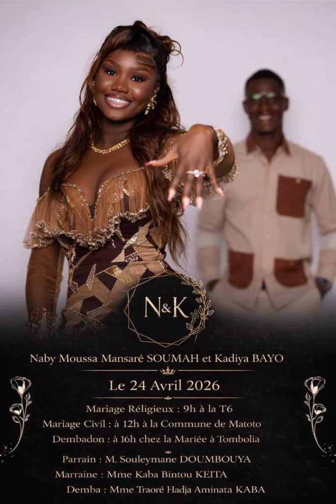 Le vendredi 24 avril 2026, le journaliste Naby Moussa Mansaré Soumah et sa promise, Kadiya Bayo, se diront « oui » lors d’une journée placée sous le signe de l’élégance et du respect des racines.Bien plus qu’une simple formalité, ce mariage est perçu par les deux familles comme un véritable pont jeté entre leurs histoires respectives, célébrant des valeurs de transmission et de fraternité.Un Marathon de Célébrations : Le Programme